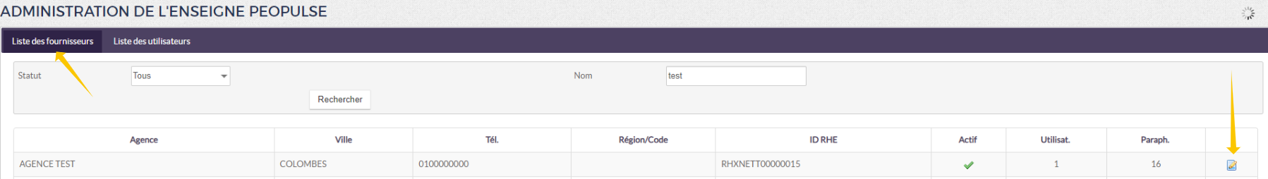 • Puis cliquer sur l'icône  " Editer " pour modifier la fiche agence, en bout de ligne :